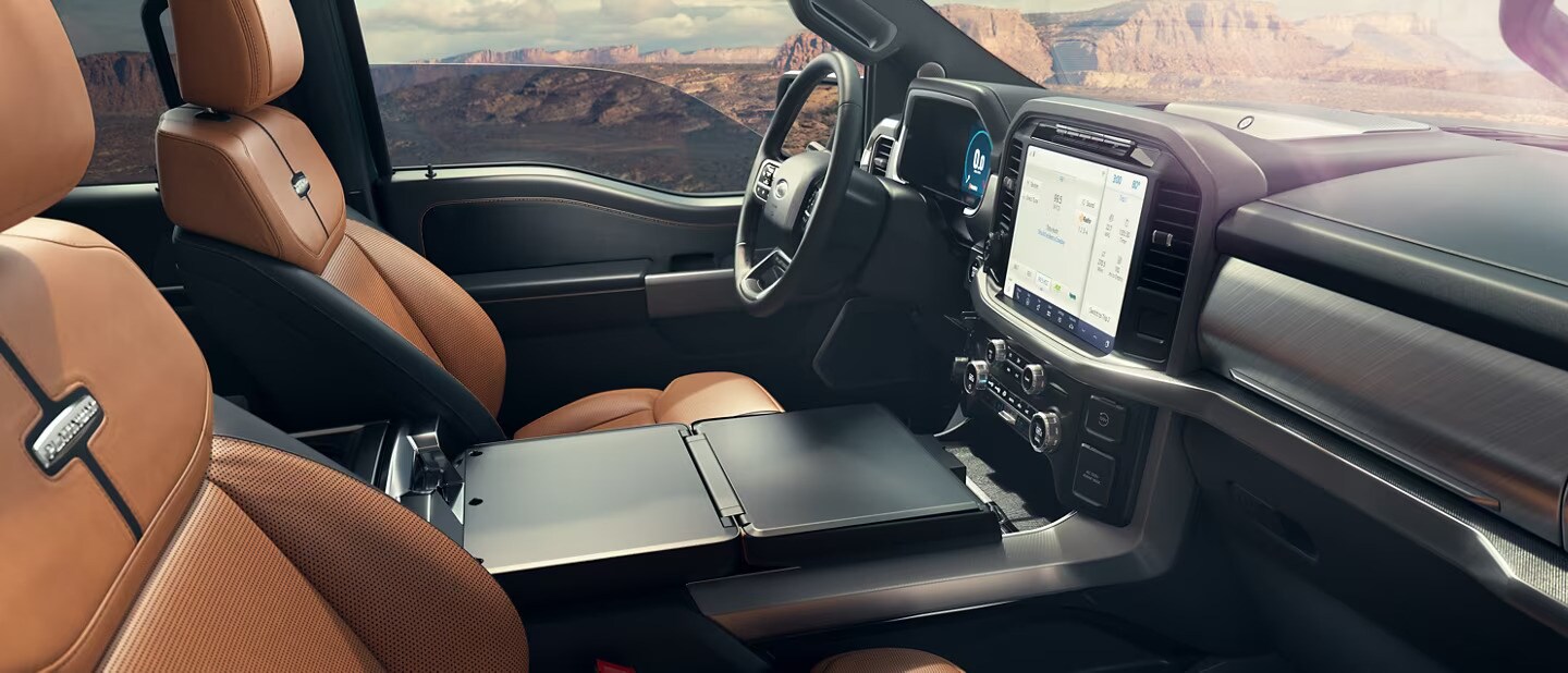 The 2023 F-150® integrates an in-vehicle desk that folds down next to the driver's seat. This available feature makes it ideal for signing paperwork, working on a 15-inch laptop, or a quick lunch break while parked. You can even play cards or enjoy concessions at a drive-in movie.
