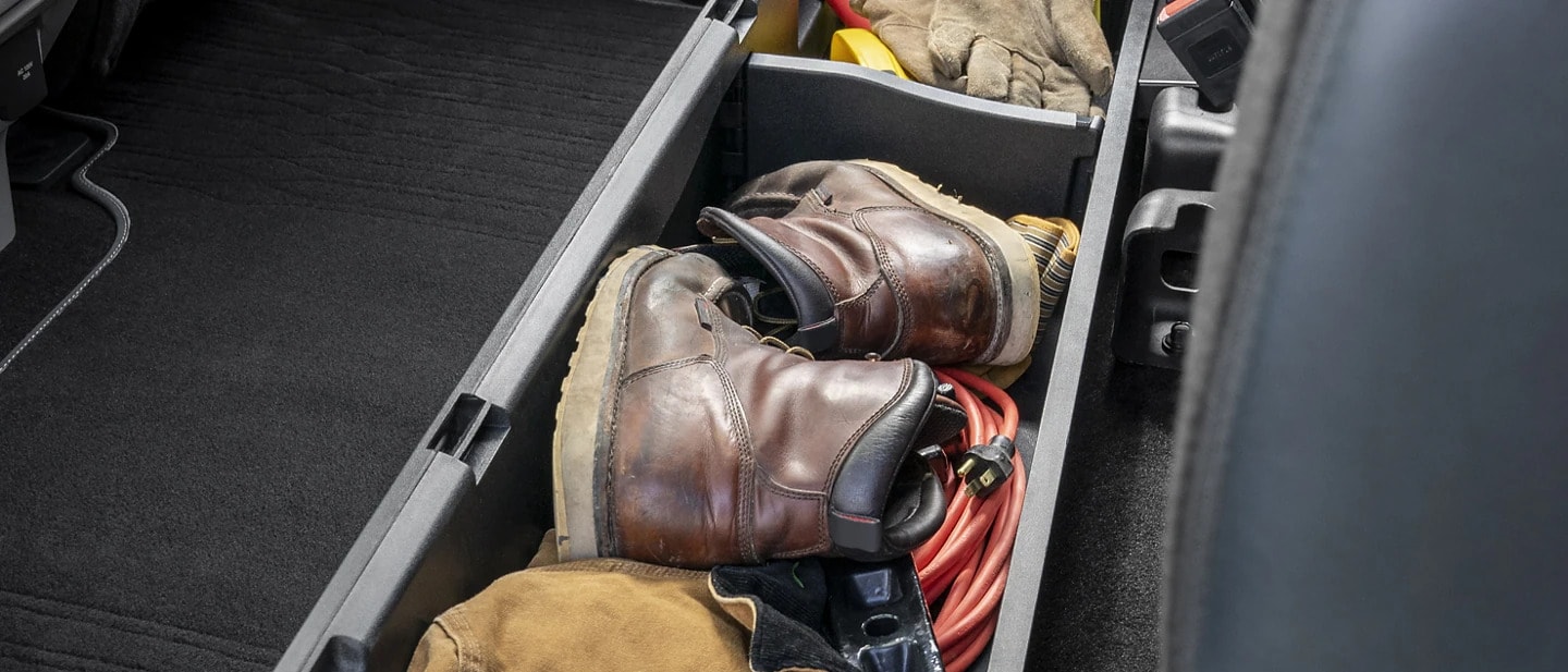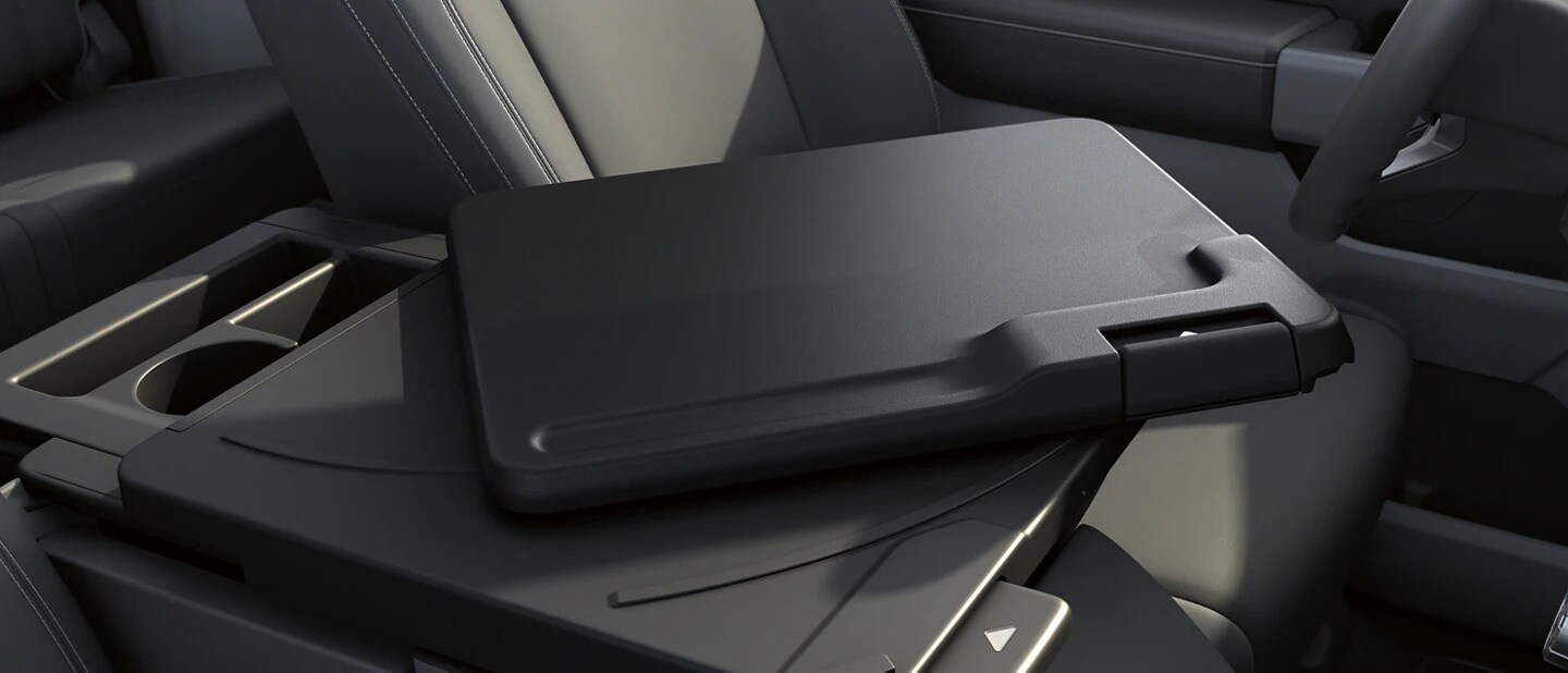 Enhance your work productivity with ergonomic design. The available Interior Work Surface transforms your truck into your mobile office. The gear shift stows away so that you can unlock your center console to create a flat surface space or desk, that can slide forward and swivel toward you to help you use with your laptop while seated comfortably.STOWABLE SHIFTER