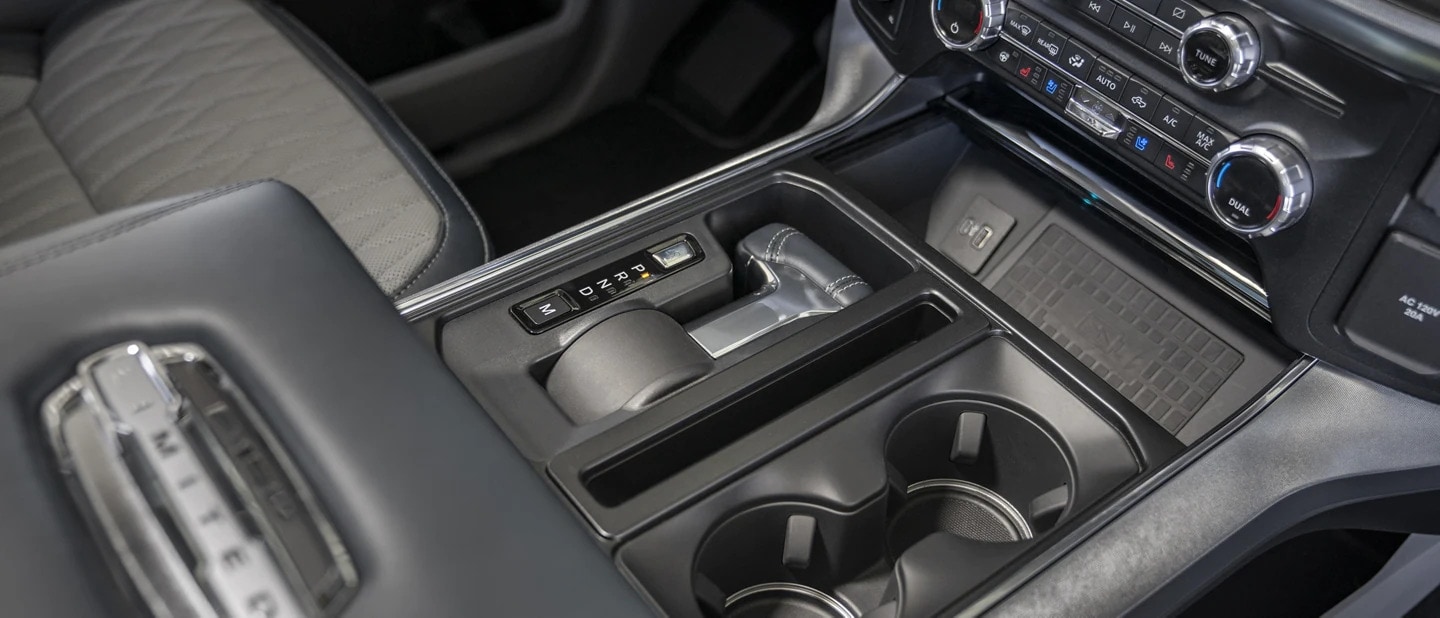 With the push of a button, the gear selector stows away to reveal a flat work surface to fold out. When parked, the available Stowable Shifter lays flat so you can open the available work surface.